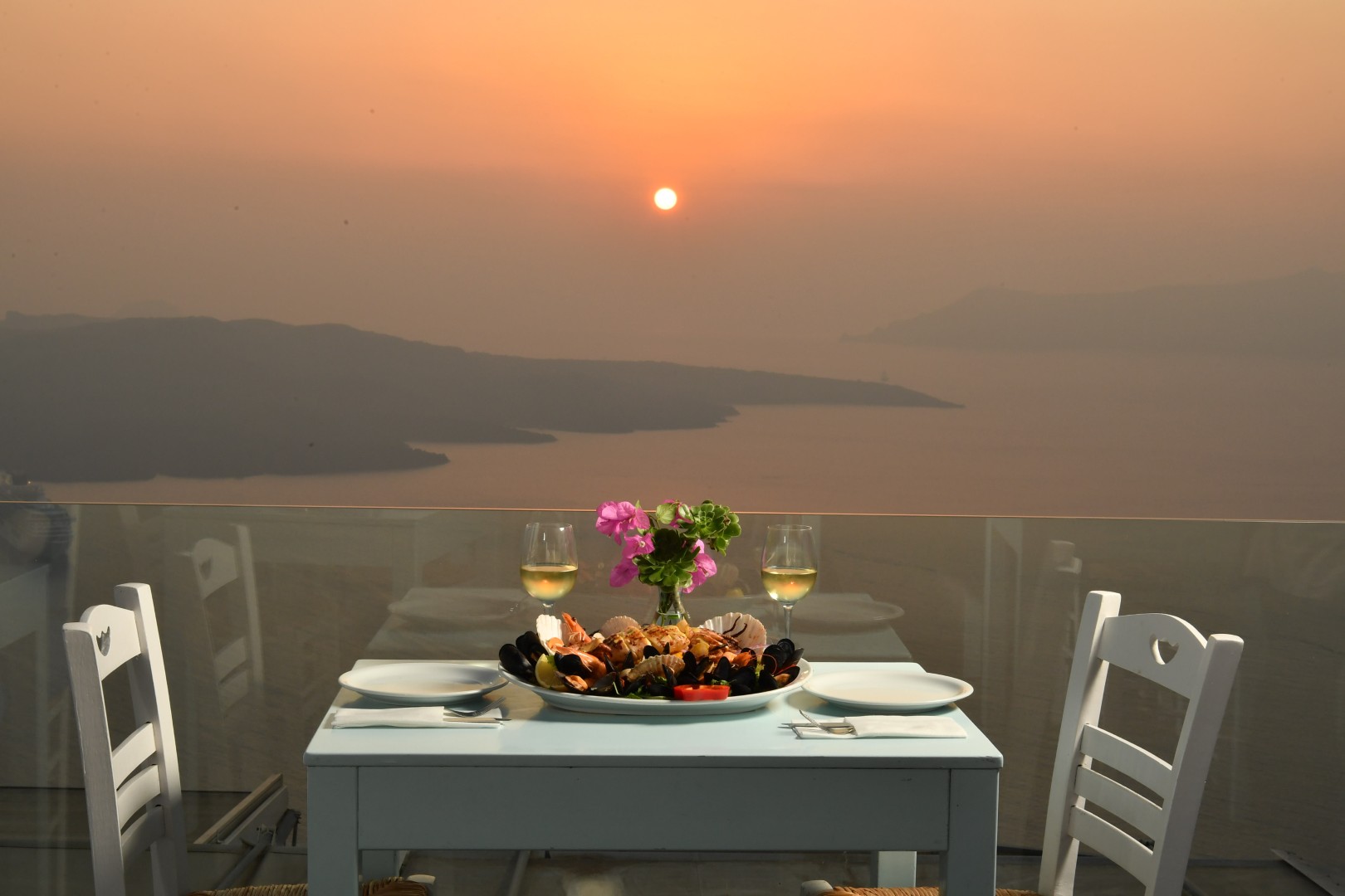 Santorini, a world-famous destination for its inimitable romantic allure, its unique volcanic landscapes and its heart-warming tastes welcomes visitors from around the world who come to enjoy the amazing scenery, elegant corners and above all delicious, fresh food. Perched on a privileged location on the caldera of Fira, Volcano Blue Restaurant boasts breath-taking views to the sea, the caldera and the volcanoes. On the Volcano Blue terrace, with the caldera cascading to the sea beneath your feet, the magnificent sunsets that made Santorini such a treasured and romantic destination are simply breath-taking, and you are more than welcome to enjoy them along delicious summery cocktails and mouth-watering seafood delights!